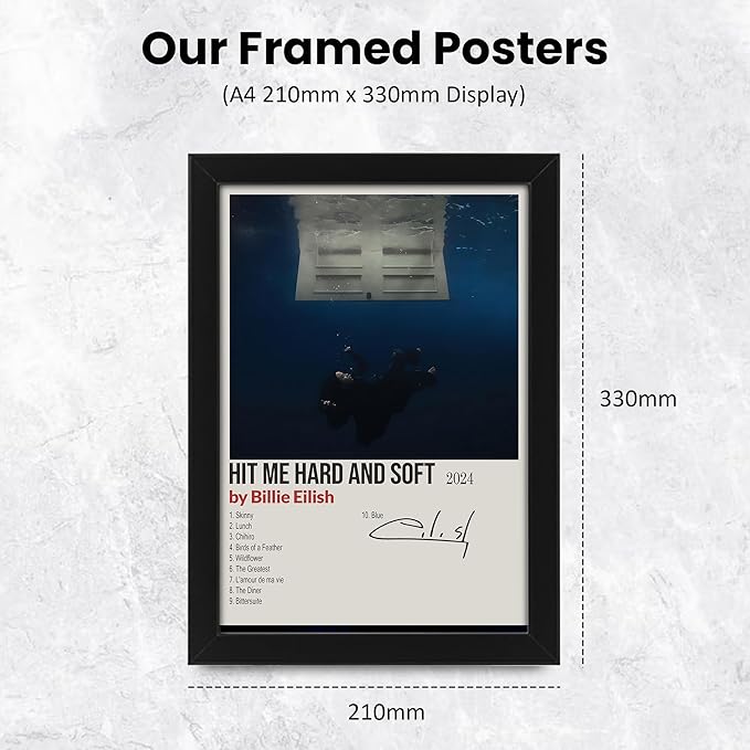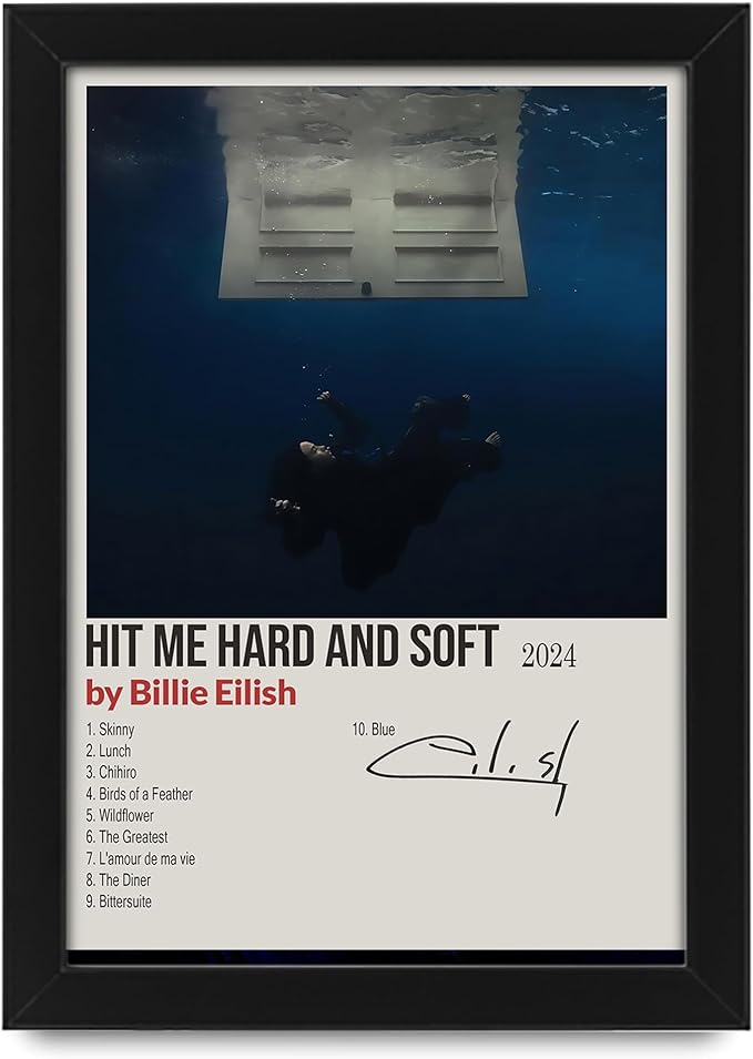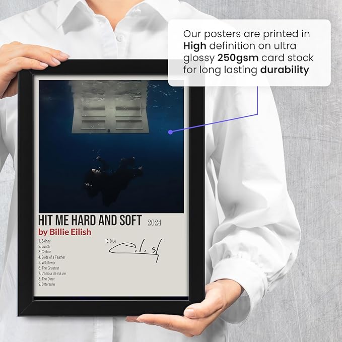 Billie Eilish: Dive into the mesmerizing world of one of music's most influential artists, known for her haunting vocals and boundary-pushing style, with this signed poster from her 'Hit Me Hard And Soft' album.