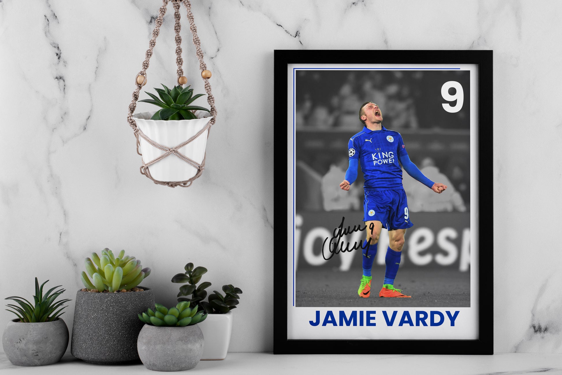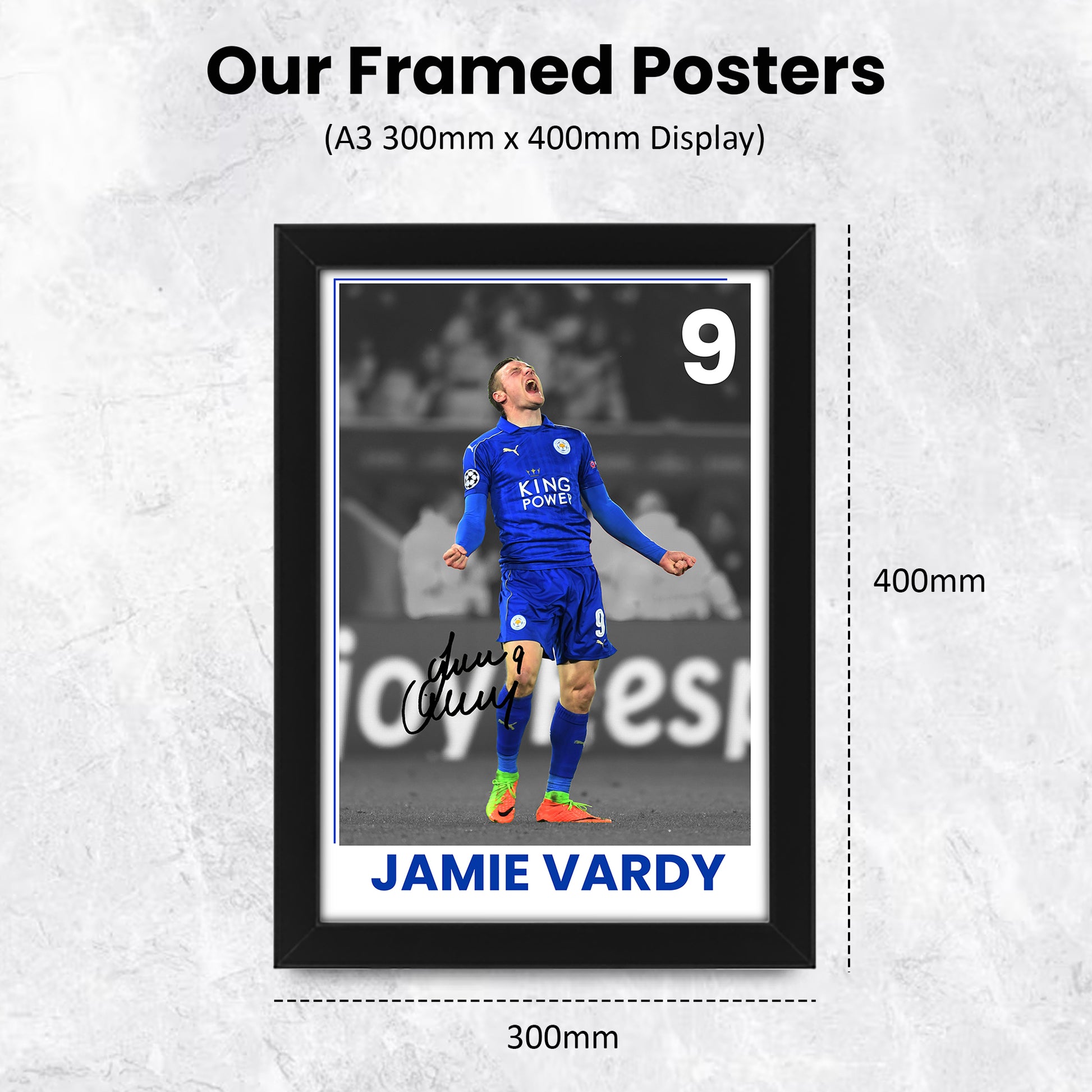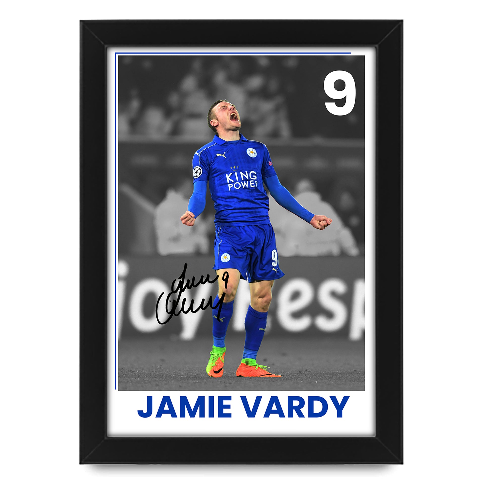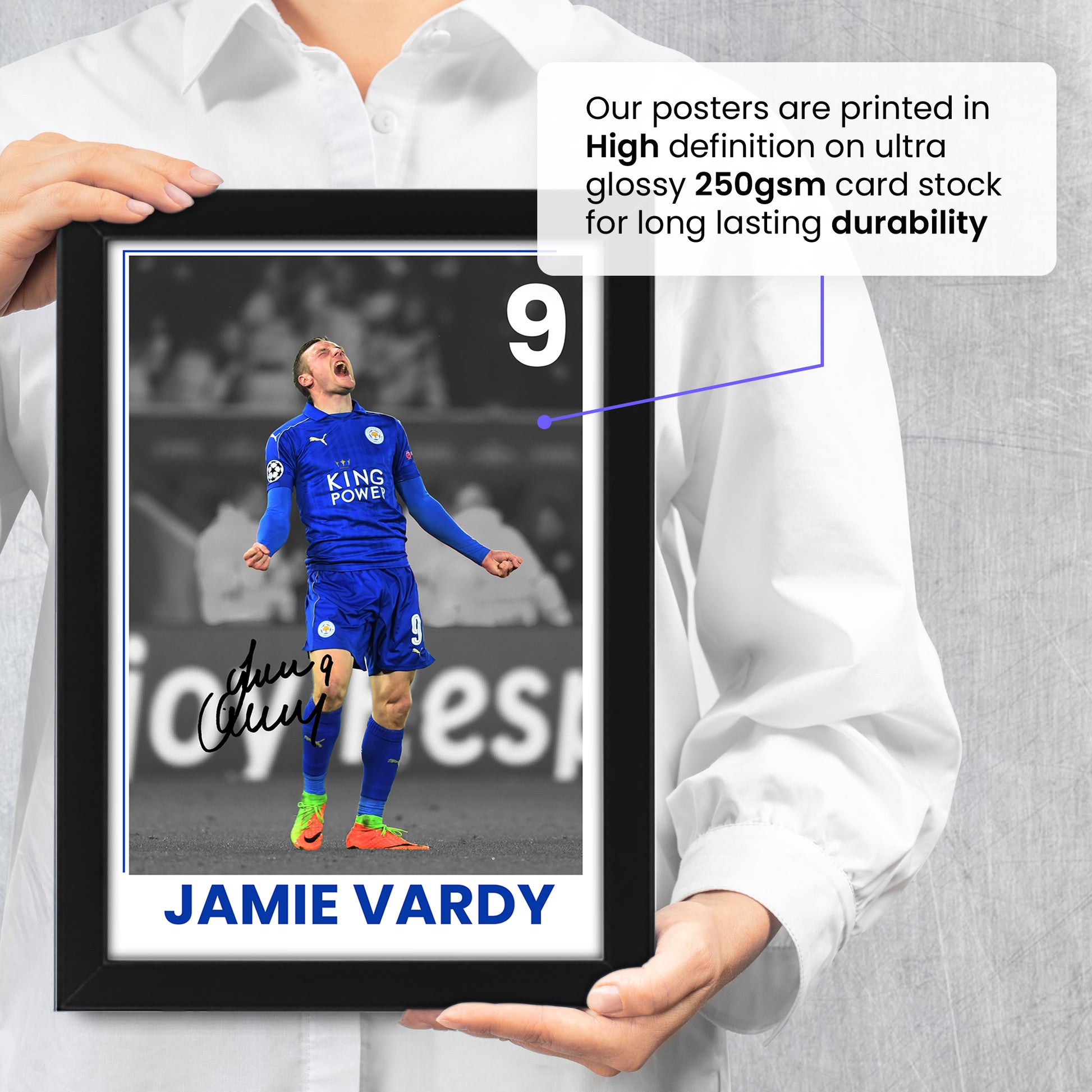 - Celebrate your love for football with this exclusive Jamie Vardy signed poster print. As a limited edition piece of memorabilia, this autographed artwork is a must-have for any true Leicester City FC fan. Whether you're looking to enhance your Mancave décor, surprise a friend with a unique gift, or simply add to your collection, this signed poster is the perfect choice.