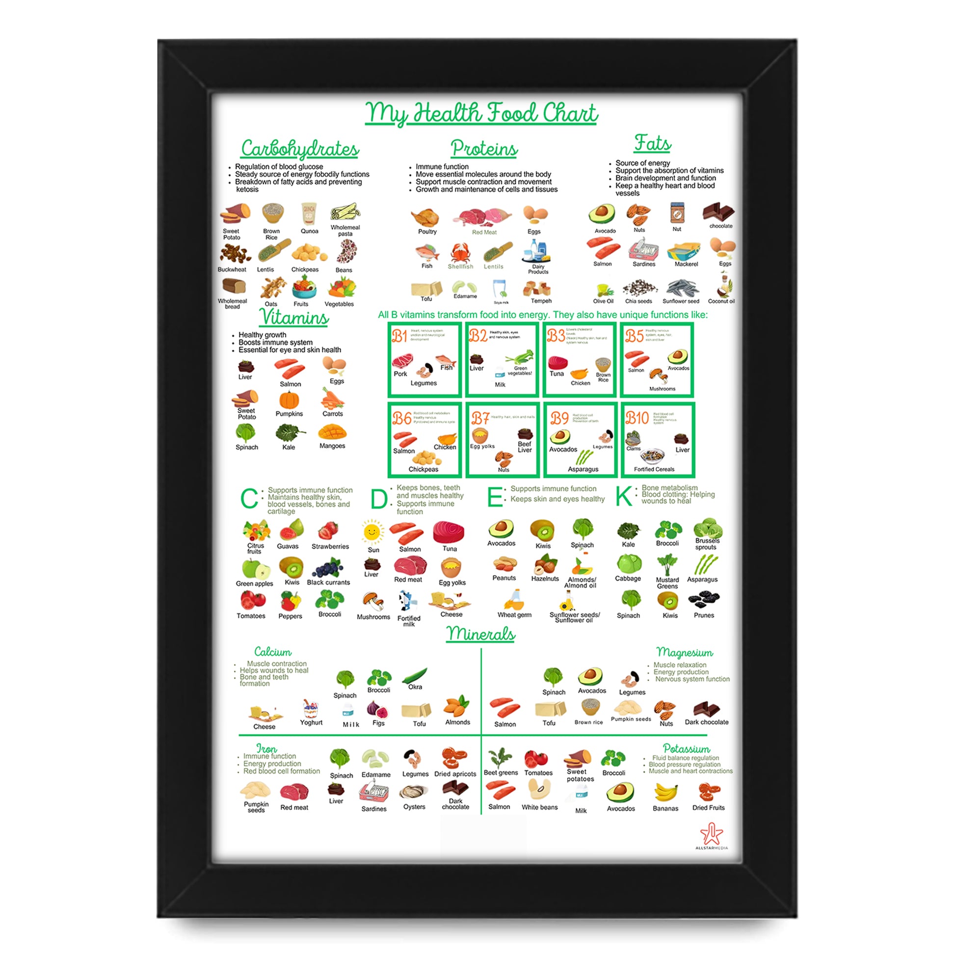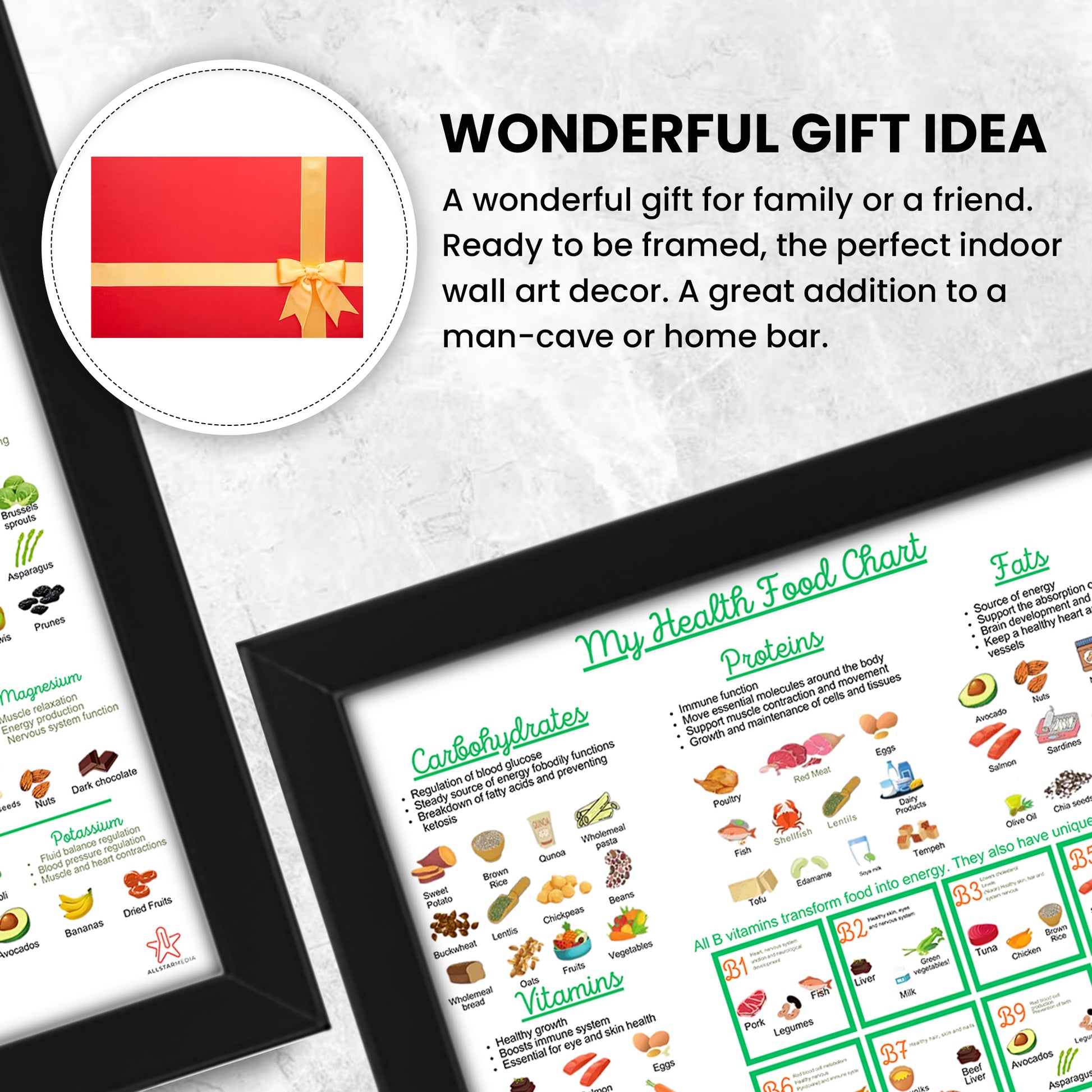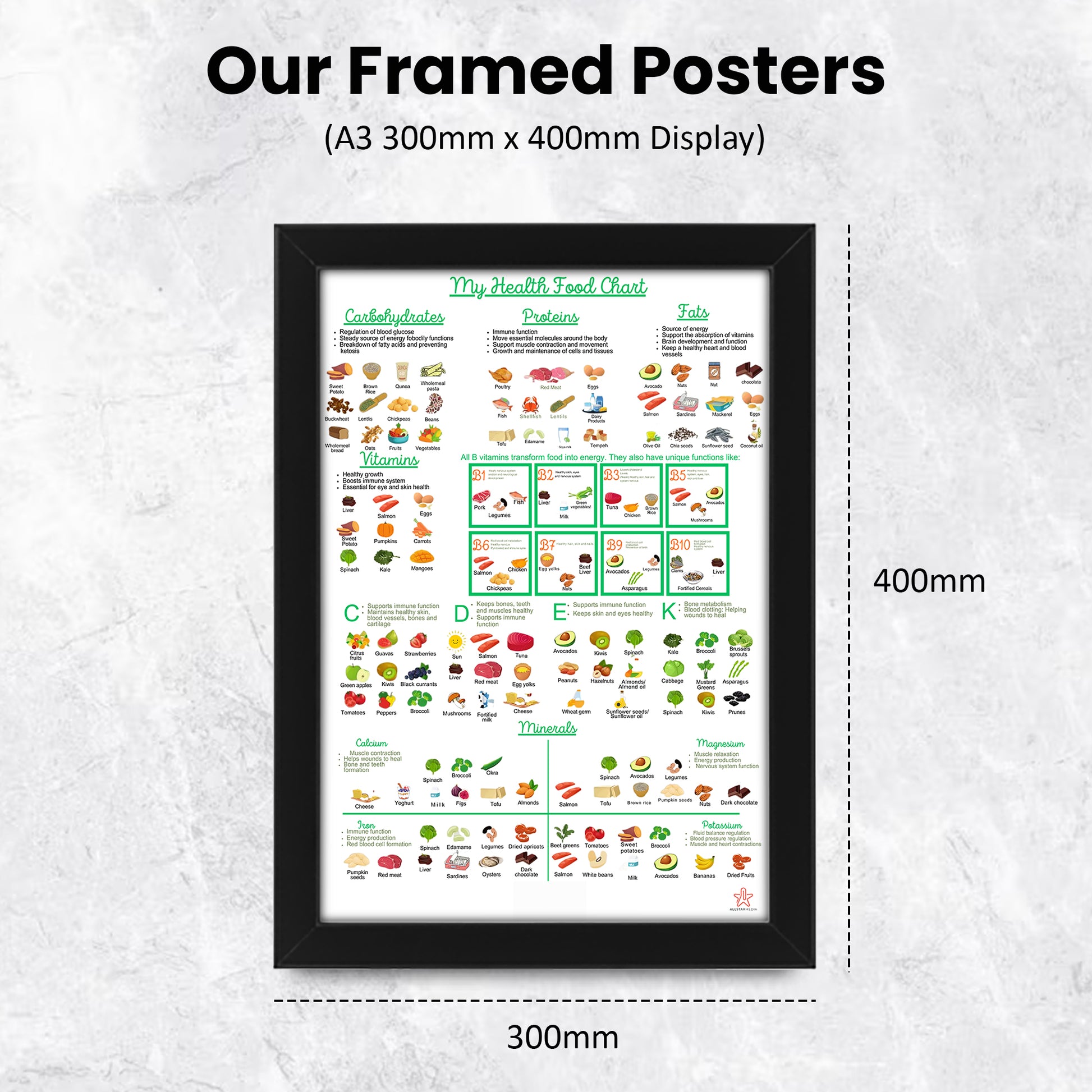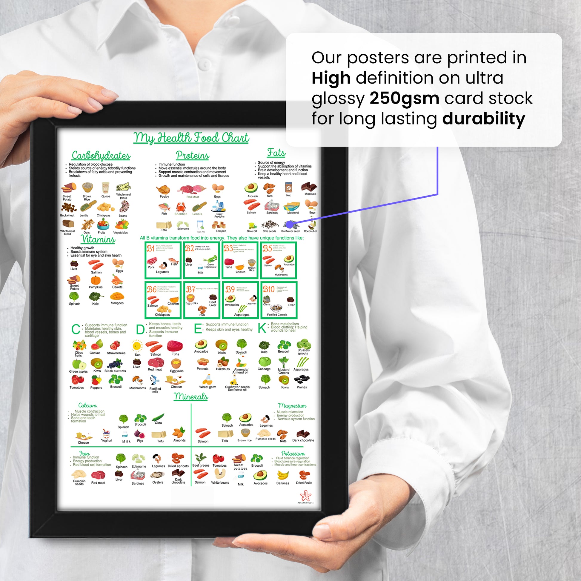 Product descriptionTransform your kitchen into a hub for healthy living with My Health Food Chart. Available in both Framed and Unframed A3 sizes (30x40cm), this beautifully designed wall chart serves as a constant reminder to make healthier food choices. Whether you're looking to lose weight, maintain a balanced diet, or teach your family about nutrition, this chart makes healthy eating easy and fun. It features a food pyramid, meal planner, and grocery list, helping you stay organized and motivated on your wellness journey. Perfect for individuals, families, and even classrooms, this Educational Healthy Eating Chart offers visual inspiration for nutritious meal planning. Whether you’re focusing on macronutrients, portion sizes, or daily meal ideas, this chart offers a simple guide to healthier living. It’s an ideal tool for both adults and kids, encouraging everyone to develop lifelong healthy habits. Designed for versatility, My Health Food Chart not only supports weight management and wellness but also doubles as motivational kitchen decor. This is the perfect gift for those aiming to achieve healthier lifestyles, and it complements any kitchen, dining room, or office space.