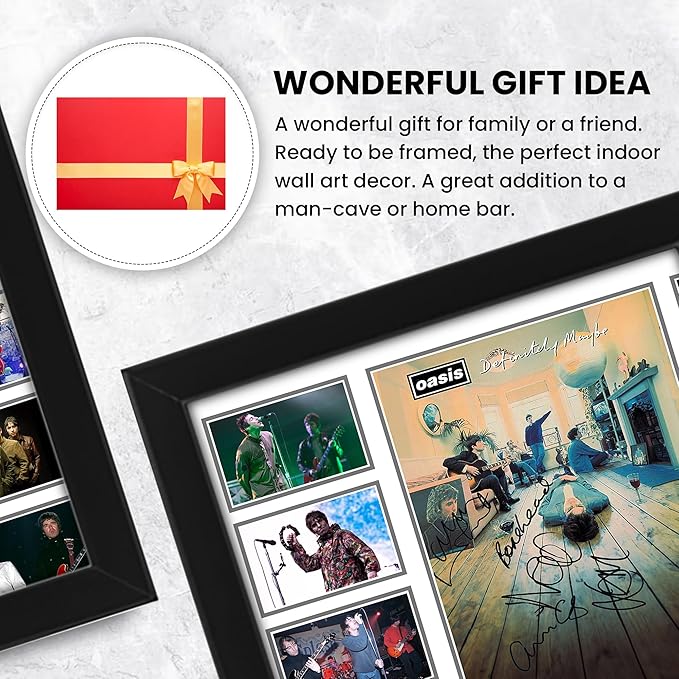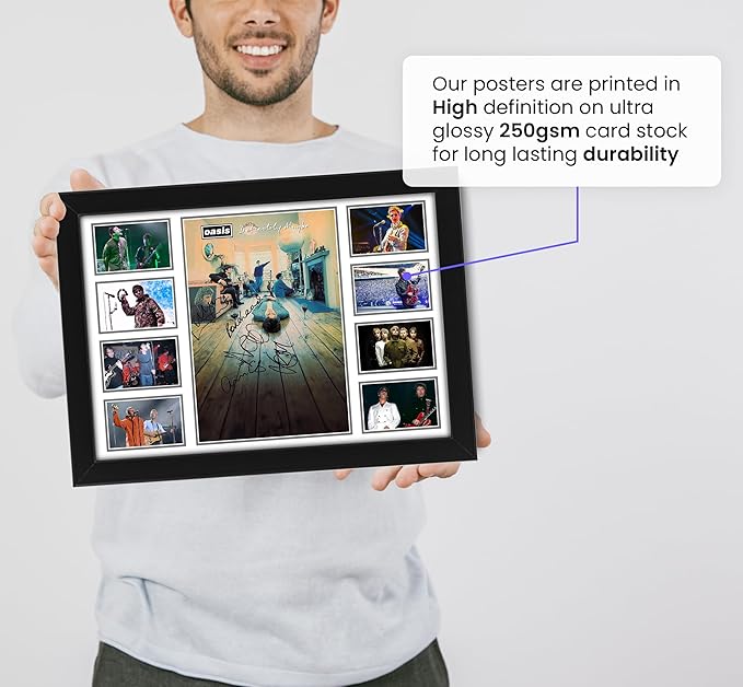Limited Edition Signed Oasis Poster Print – A Must-Have Collectible for Every Fan Celebrate your love for one of the greatest British rock bands of all time with this Limited Edition Signed Oasis Poster Print. This exclusive piece of memorabilia is the ultimate collectible for any Oasis fan, capturing the spirit and essence of the band’s incredible journey. Whether you're a fan of their early hits like "Wonderwall", "Don't Look Back in Anger", and "Champagne Supernova", or you love their later work such as "The Importance of Being Idle", this autographed poster is a tribute to their iconic music career. Features the printed signatures of band members, including the iconic Liam Gallagher and Noel Gallagher. As the driving forces behind Oasis, their contributions to rock music are unparalleled, and this poster serves as a lasting reminder of their influence. For any true fan, owning a piece of history signed by the Gallaghers is a dream come true. Limited Edition Collectible Merchandise. This signed Oasis poster is part of a limited edition release, making it a rare and highly sought-after item. Whether you’re an avid collector of Oasis memorabilia, a fan who attended legendary tours like "(What's the Story) Morning Glory?" Tour, The Be Here Now Tour, or Familiar to Millions, or you simply want to add a special touch to your personal space, this autographed poster will stand out in any collection. Its rarity ensures that it will only grow in value over time, making it a great investment for collectors. High-Quality Poster Print Featuring Iconic Band Artwork The poster print features high-resolution artwork, showcasing the band in their prime. From their rise to fame with the chart-topping album "Definitely Maybe" to their global superstardom with albums like "(What's the Story) Morning Glory?", "Be Here Now", and "Standing on the Shoulder of Giants", this poster visually captures the energy and charisma of Oasis. The vibrant colors and attention to detail make this poster a true piece of art, perfect for framing and displaying in any room. It’s a fantastic tribute to Oasis' enduring legacy and instantly recognizable by fans of all generations. Perfect Gift for Oasis Fans and Collectors Looking for the ideal gift for an Oasis fan? This limited edition signed poster print is the perfect present for birthdays, holidays, or any special occasion. With references to legendary songs like "Live Forever", "Supersonic", and "Cigarettes & Alcohol", and a design that celebrates the iconic band lineup of Liam Gallagher, Noel Gallagher, Paul Arthurs, and Paul McGuigan, this poster will delight any fan of the Britpop movement.