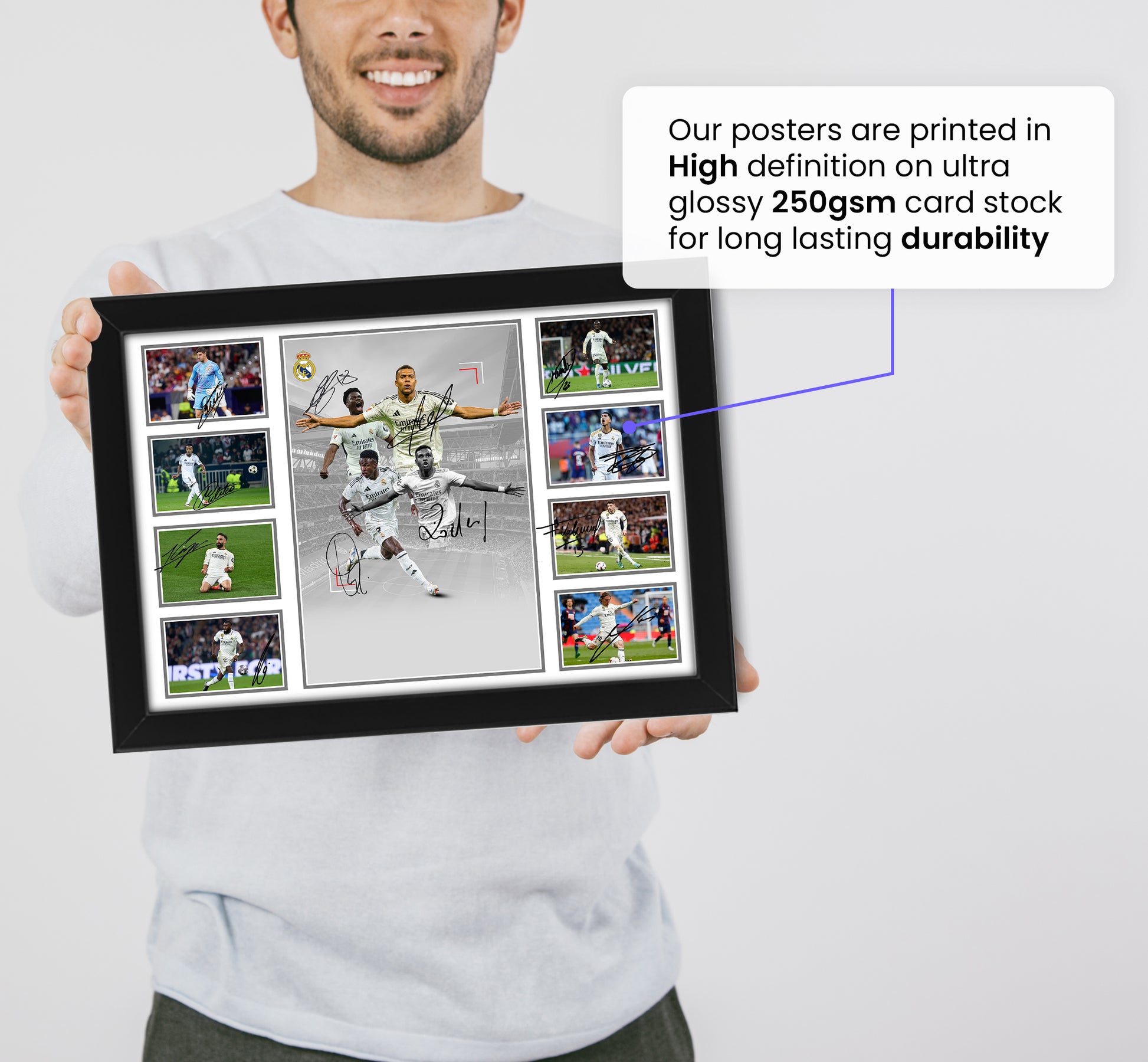 - All posters are produced in-house using AI imaging techniques and creative commons licensed pictures, Featuring a likeness of the stars signatures and produced in a limited edition of 999 units. A perfect gift for collectors, football enthusiasts, and loyal Real Madrid supporters, commemorating the 2024-25 season.